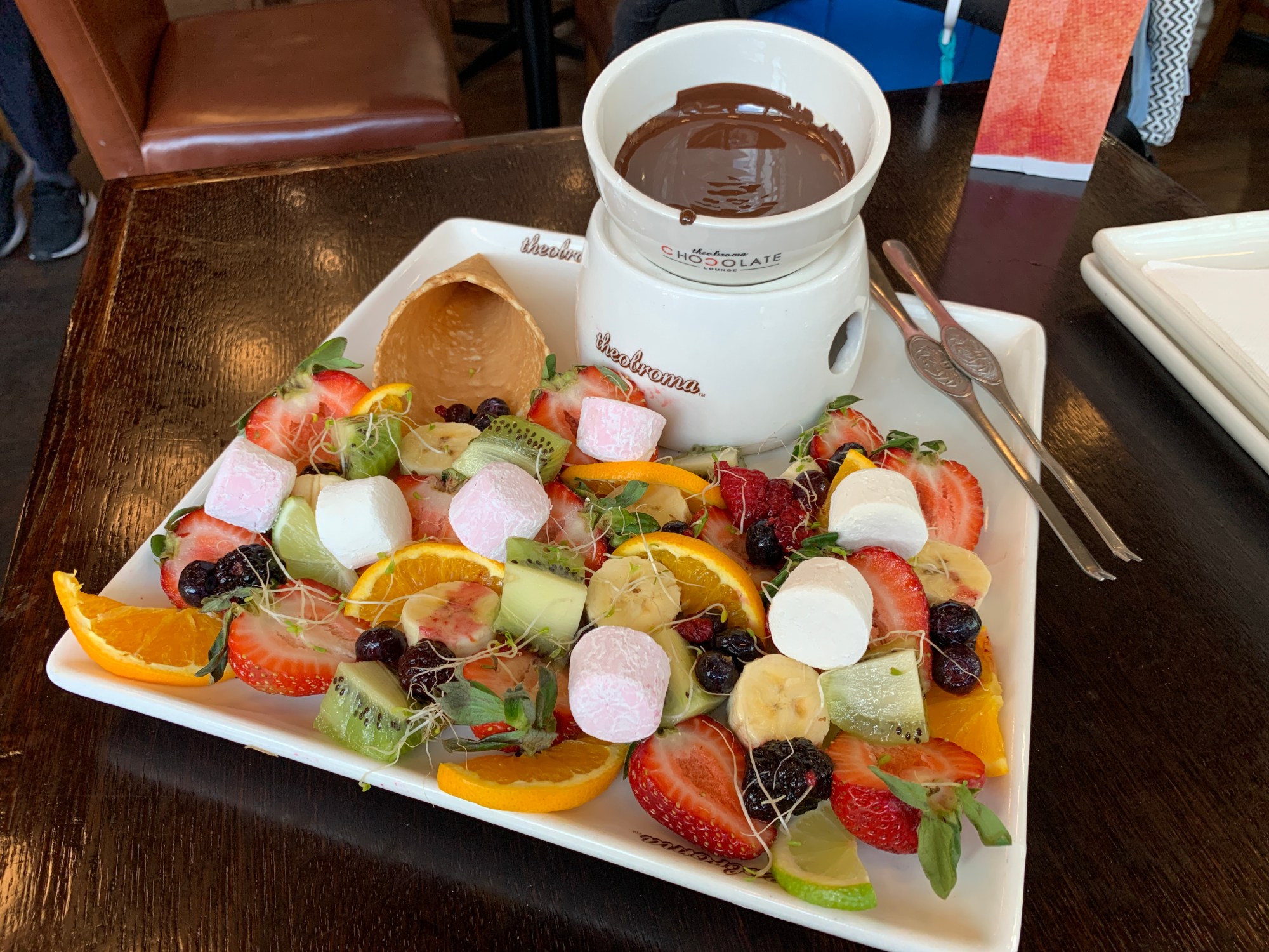 Of course we couldn’t leave without trying Theobroma’s signature Chocolate Fondue! A huge array of fresh fruits, berries & marshmallows alongside a bowl of warm molten chocolate! So many yummy dipping options, this is a great dessert for 2 or even 3 people to share.
