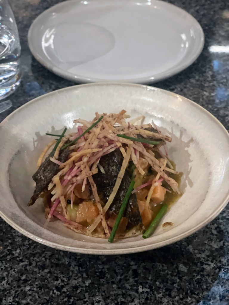 Kinilaw ocean trout, guava aguachile with heirloom radish and fried taro: quite a refreshing mix of trout ceviche-style with a good balance of guava flavoured sauce and crunchy finely sliced taro topping