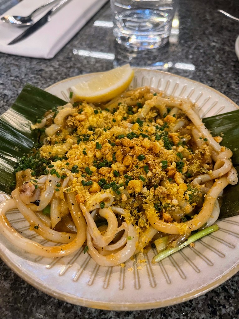 King prawns with onion piaya. Juicy, soft, and served with an amazing onion filled flatbread. Order extra flatbread, it’s delicious.