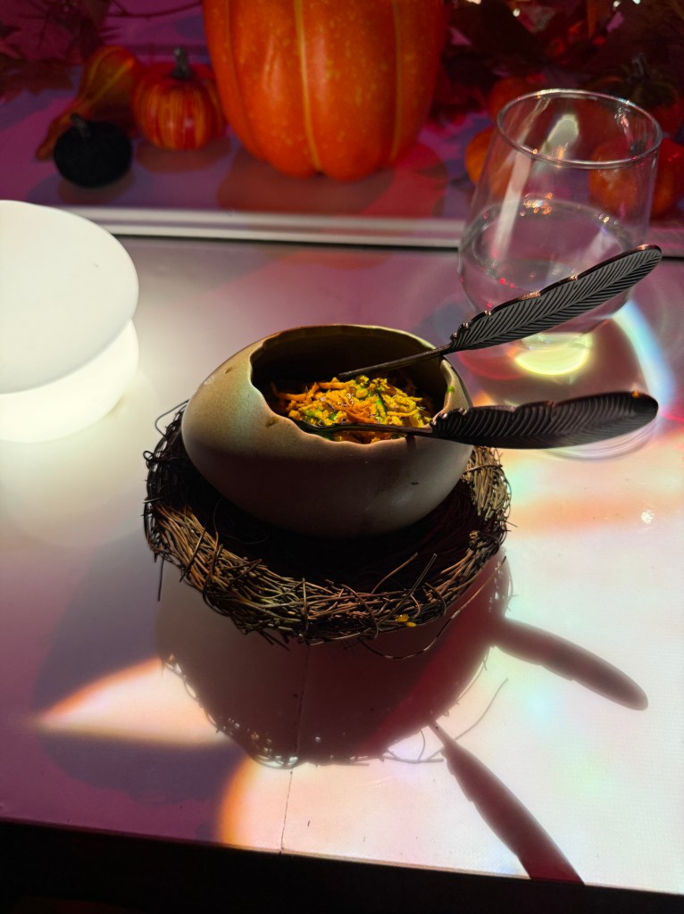 The playful approach continues with the cutlery. Every course comes with its own unique and often whimsical set, encouraging diners to engage differently with each dish and reinforcing that this is meant to be interactive rather than passive dining.