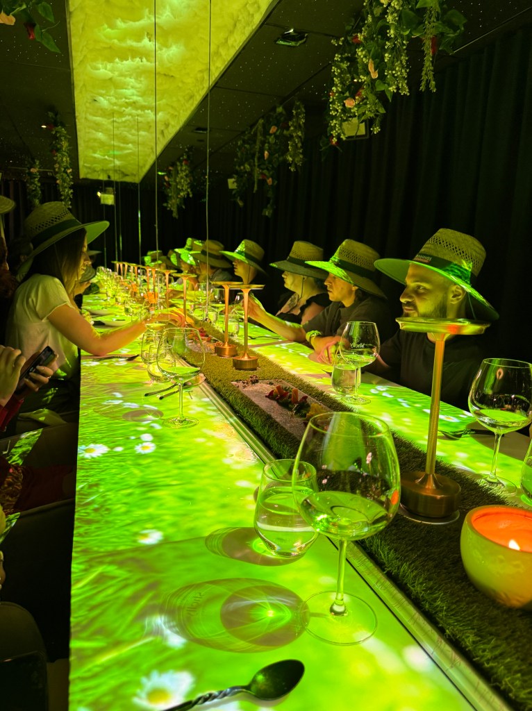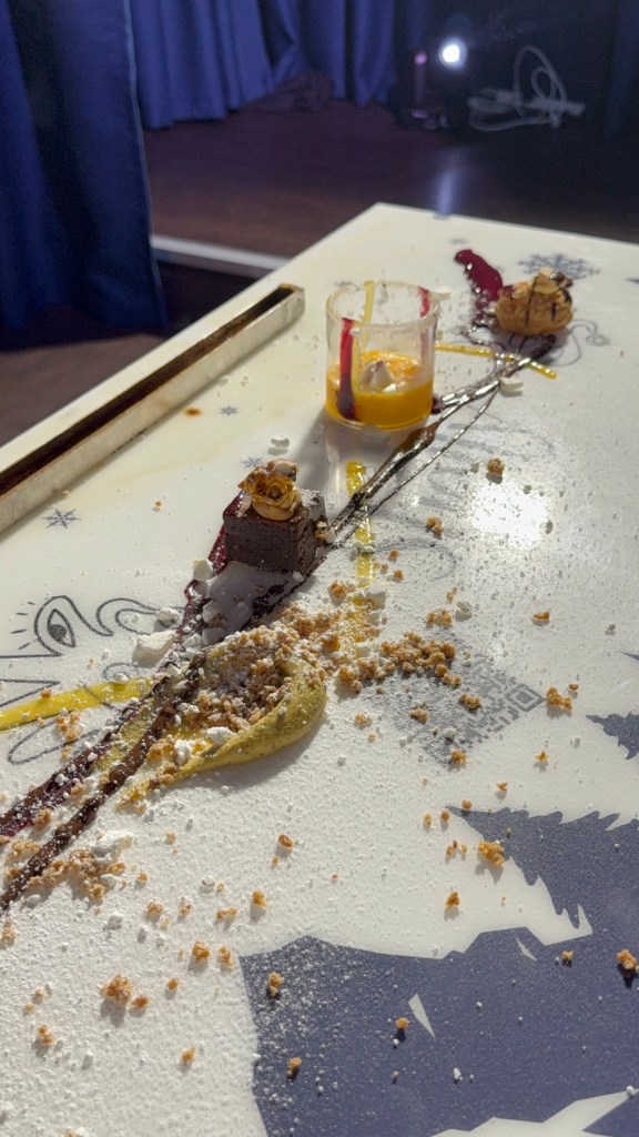 Winter closes the night at full throttle. This is not a gentle finale. Chefs swarm the table, performing a choreographed dance of plating, squeezing rich sauces and building intensity as the room takes on a fireplace like glow. Flames, warmth and movement dominate the space. Just when you think it is over, you are asked to become part of the final course. Diners are invited to paint on an edible canvas made of meringue, turning dessert into a hands on act of creativity.